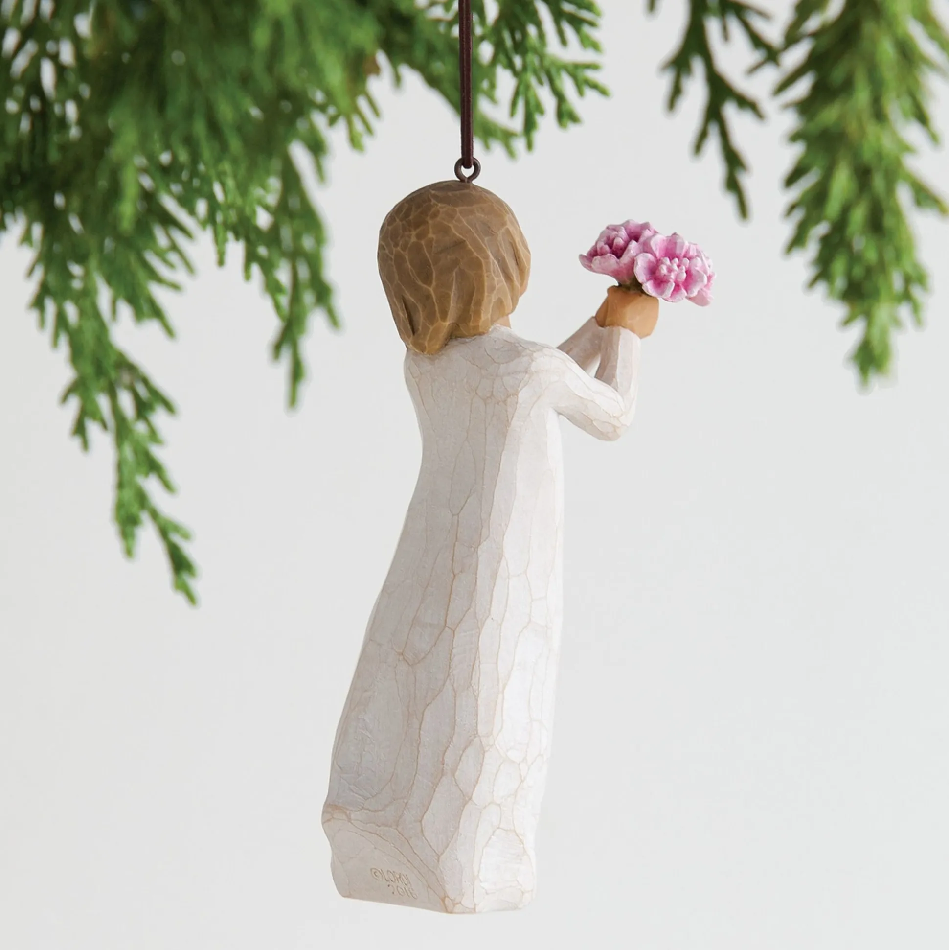 For Holidays Or For Everyday, Ornaments Celebrate Life’s Milestones In A Small, Commemorative Format. This Ornament Is A Smaller-Sized Version Of Thank You #27267 With Brown Elastic Cord For Hanging. ‘Thank You’ Is An Expression We Use Daily… From An Impersonal Quick Comment To A More Heart-Felt Appreciation Of Support From Parents, Family, Friends, Teachers, Volunteers. The Gesture Of The Figure, Leaning Forward, Is An Offer Of Gratitude And Hospitality. The Flowers Are Classic, Timeless Peonies, Which Release A Beautiful Fragrance, And Whose Lifecycle Can Span Generations. —Susan Lordi
