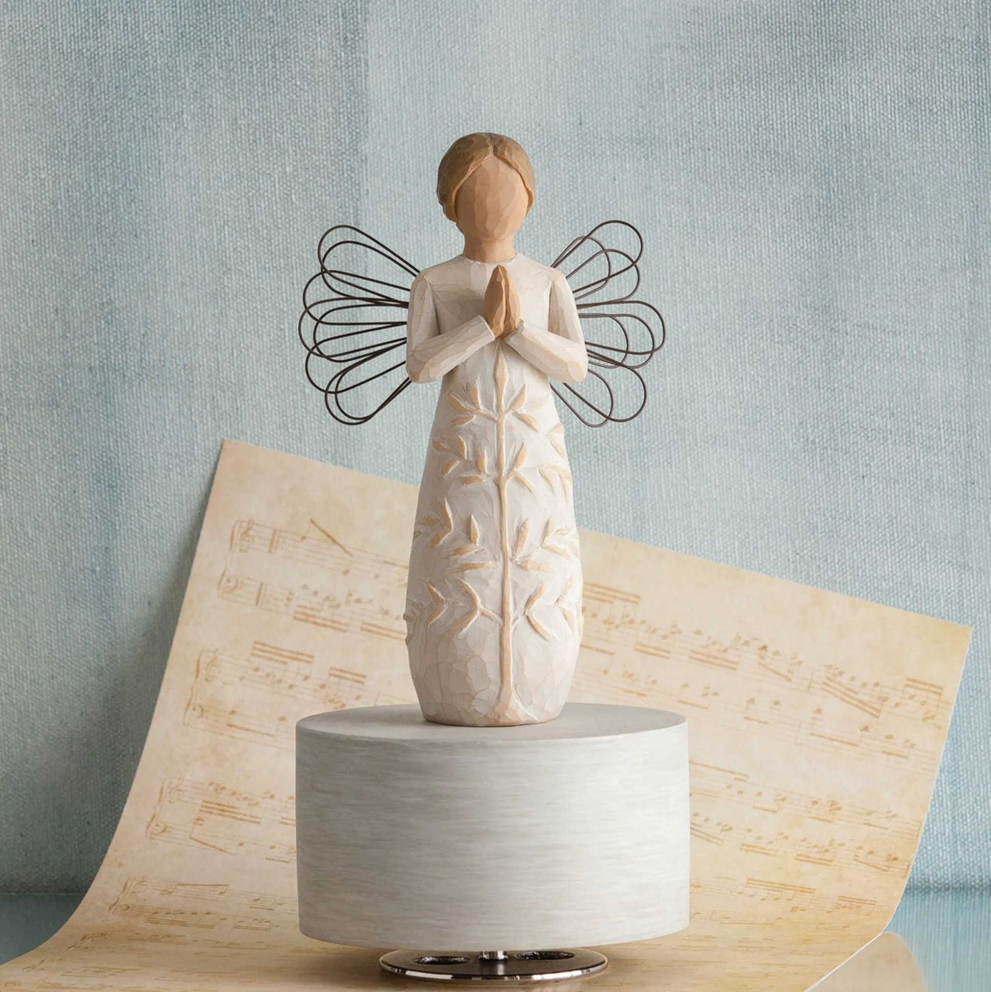 Music And Movement Transform This Full-Scale, Beloved Figure. The Hand-Painted Base Elevates The Figure While It Turns Beautifully To The Classic, Familiar “Amazing Grace”.A Tree Can Be A Metaphor For Strength, Beauty And Peace — Qualities We All Aspire To. The Prayer Is One Of Hope And Healing; About Living In The Moment. The Title Is As Much A Prayer As The Sentiment. This Piece Is Very Open. The Tree Can Be A Symbol Of Anything That Is Centering And Inspirational. Trees Are Grounding — A Connection To That Which Sustains Us. It Could Also Reference The Tree Of Life — A Universal Symbol In Many Different Religions, Both Christian And Non-Christian. –Susan Lordi